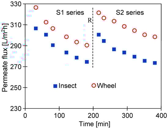 Changes in the permeate flux during the UF of the synthetic wastewater (0.5% Turbo Green + 0.2% Hydrowax solution). Initially, the UE50 membranes were soaked for 20 months in the 0.5% Insect (Insect) and 0.5% Wheel solutions (Wheel). R—denotes the cleaning of membranes with the 0.5% Insect solution (2 h). TMP = 0.1 Mpa.