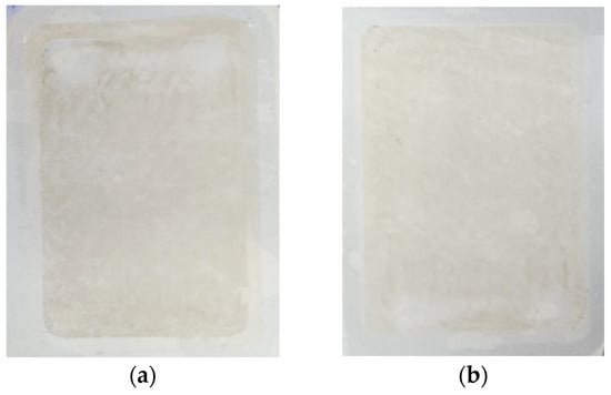 Images of the surface of the UE50 membranes collected from the UF modules after the treatment of the synthetic wastewater. Initially, the membranes were soaked for 20 months in (a) the 0.5% Wheel solution and (b) the 0.5% Insect solution.