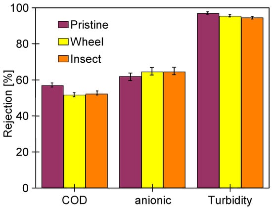 During the S1 series, after 2 h of the process (Figure 22), the samples were taken to assess the rejection of the components present in the synthetic wastewater. It was found that despite a significant deterioration of dextran rejection (Figure 21), the retention of COD, anionic surfactants, and turbidity was similar to that observed for pristine membranes. The turbidity removal was close to 95% for all membranes. The COD rejection decreased from 60 to 52%; however, it was less severe than that observed for the filtration of the 0.5% Insect solution (approximately 45%, Figure 19). Similarly efficient separation was obtained in the coagulation–filtration process, for which the turbidity and COD removal reached approximately 90% and 60%, respectively [5]. In the UF process, apart from the influence of pore sizes, the separation is also affected by the formation of a fouling layer, whose presence on the membranes’ surface was confirmed (Figure 23). This conclusion is supported by similar results obtained for the membranes soaked in the 0.5% Insect and 0.5% Wheel solutions (Figure 24). On the opposite, during filtration of the 0.5% Insect solution, which did not form deposits, lower rejection was obtained for membranes soaked in 0.5% Wheel (Figure 19). The presence of the fouling layer contributed also to the observed improved retention of the anionic surfactants compared to the pristine membrane (Figure 24).