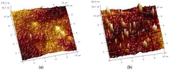 After completing the experiments presented in Figure 22, the membranes were soaked in deionized water overnight, and then the sediment visible in Figure 23 was rinsed with a strong stream of water, which allowed the white color of the membranes to be regained. The AFM images of the surface of such washed membranes are shown in Figure 25. It can be seen that the surface of the membranes applied during the treatment of the synthetic wastewater differed compared to the membranes only soaked for 20 months (Figure 12c,d). The roughness parameters for the membrane soaked in the 0.5% Insect solution decreased significantly after the UF of wastewater (Table 1, filtered), e.g., for Rq from 27.9 nm to 15.8 nm. On the surface of the membranes soaked in the 0.5% Wheel solution and applied in the treatment of the wastewater, the residues of sediment are visible, the presence of which increased the value of the Rq from 20.3 to 25.6 nm.