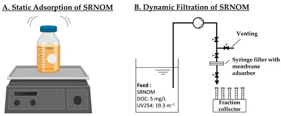 Experimental set-ups for (A): static adsorption of SRNOM on an orbital shaker (created with BioRender.com); (B): dynamic filtration of SRNOM with a peristaltic pump and fraction collector.