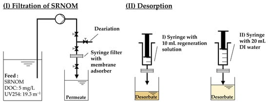 Adsorption refers to the process of removing or adhering molecules or substances from one phase, such as water, to a surface, such as a membrane. This process is widely utilized in water treatment [11], such as in the removal of heavy metals [12] or NOM [13]. Adsorptive membranes (AM), a special type of mostly macroporous membranes, are designed to integrate the steric retention of conventional membrane filtration with the properties of adsorptive materials, offering the advantage of high selectivity coupled with high adsorption capacities [14,15]. Membrane adsorbers, a subclass of adsorptive membranes, are configured to function more like a traditional adsorbent but within a membrane filtration configuration, typically consisting of a porous base matrix that is functionalized with adsorptive materials/groups [16].