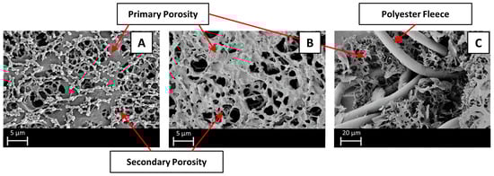 In the cross-section in Figure 3C, an additional element of reinforcement is visible in the membrane structure. A coarse structure composed of polyester fleece is incorporated for mechanical stability, enhancing the robustness and durability of the membranes. Considering the regenerated cellulose-based backbone of the membrane, additional mechanical support is required to withstand operational stresses, like particulate matter. As further elucidated by Wang et al., the mechanical stability of the membranes is significantly attributed to the thick polyester fibers (~10 μm diameter) that are concentrated in the middle section of the membrane [37].