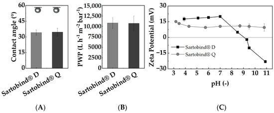 Membrane characteristics of Sartobind® D and Q: (A) contact angle determined using captive bubble method; (B) pure water permeability determined across three pressures (0.6, 1, 1.2 bar); (C) zeta potential determined through titration from pH 11 to pH 3 using the streaming current method over a pH range of 3–11 using the streaming current method.