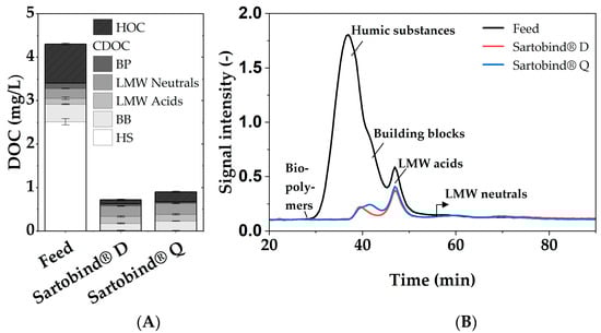 (A) Fractionation of HOC and CDOC and (B) LC-OCD chromatograms of the feed and permeates of Sartobind® D and Q.
