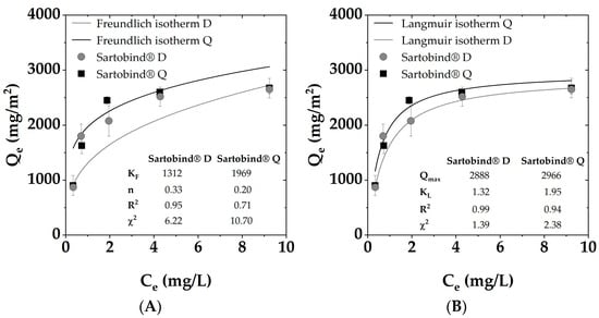 The Qmax values derived from the Langmuir isotherm were found to be in a comparable range, with 2888 ± 112 mg C/m2 for the Sartobind® D and 2966 ± 153 mg C/m2 for the Sartobind® Q.