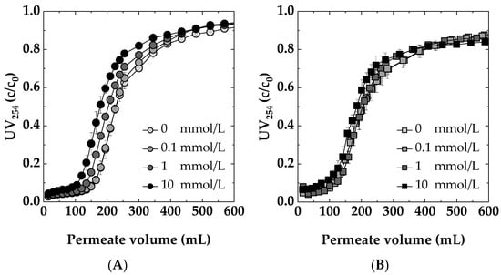 It is essential to emphasize that membrane adsorption is inherently a dynamic process when applied in flow-through mode, and the time/treated volume until a breakthrough occurs holds significant importance, as it is a key parameter for process design in practical applications. Hence, dynamic breakthrough experiments were conducted utilizing a peristaltic pump (ISM931A, Ismatec, Wertheim, Germany) and a polycarbonate syringe filter holder (Sartorius, Göttingen, Germany) as a membrane cell (filtration area 3.8 cm2) (see Figure 1B). To ensure even distribution of the feed, a feed spacer mesh was placed in the feed channel. Before the experiments, membranes were extensively flushed with DI water and de-aerated. Permeate collection was facilitated by an automated LAMBDA OMNICOLL® fraction sampler (LAMBDA Laboratory Instruments, Baar, Switzerland). To investigate the influence of the flux and water chemistry (pH and ionic strength) on the dynamic adsorption in each set of experiments, one of the three parameters was varied, while the others remained constant at their default values (Flux of 500 LMH, no addition of NaCl and a pH of 7). The SRNOM feed solution had a DOC concentration of 5 ± 0.1 mg/L and a UV254 of 19.3 ± 0.1 m−1. Flux variation was explored across four distinct flux rates (50, 100, 250 and 500 LMH) and ionic strength investigation involved the addition of NaCl at concentrations of 0.1, 1 and 10 mmol/L. The pH was systematically varied at pH levels of 4.5, 7, 9 and 11. All experiments were run in duplicates and analyzed in triplicates.