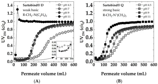 Impact of feed pH (4.5, 7, 9, 11) on dynamic breakthrough curves for: (A) Sartobind® D and (B) Sartobind® Q. Feed 5 mg/L DOC, 0 mmol/L NaCl, Flux 500 LMH.