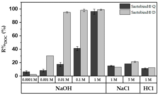 The desorption behavior of the membranes was explored using regenerants of varying molarities. Figure 10 displays the regeneration efficiency for previously adsorbed DOC, with 1 M NaOH achieving near-complete regeneration for both membranes. In contrast, 1 M NaCl and HCl achieved only about 15% regeneration. At a lower concentration of 0.01 M NaOH, Sartobind® D showed almost complete regeneration, whereas Sartobind® Q exhibited less than 20% regeneration. At higher concentrations of 0.1 M and 1 M NaOH, regeneration for Sartobind® D did not significantly increase, maintaining high efficiency. However, for Sartobind® Q, regeneration efficiency increased exponentially, reaching over 97% at 1 M NaOH. This indicates a distinct difference in the regenerative response of the two membranes to increasing NaOH concentrations, with Sartobind® Q showing a marked improvement at higher alkali concentrations.