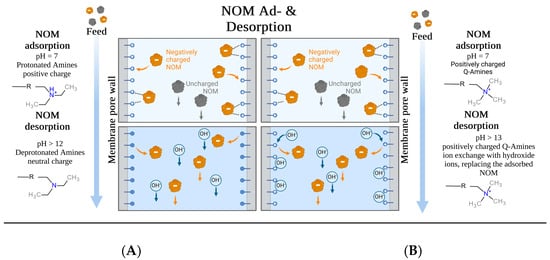 For Sartobind® D, the enhanced desorption with increasing NaOH molarity and consequently higher pH of the regenerant solution underscores that pH-swing-induced deprotonation is the primary mechanism, as supported by the zeta potential data (Figure 4C). This observation is further related to the ongoing deprotonation at pH levels above the IEP of the membrane. Such deprotonation leads to a shift from adsorptive electrostatic attraction to electrostatic repulsion, resulting in the elution and thus regeneration of NOM adsorbed on the membrane. On the other hand, Sartobind® Q possesses an intrinsic charge, yet its regeneration performance improves with increasing molarity due to the presence of hydroxide counter ions. The absence of significant regeneration with HCl and NaCl suggests that the increase in pH modifies the adsorptive characteristics of the membranes, indicating that ion exchange is not the sole mechanism relevant to the regeneration process. Figure 11 presents a proposed ad- and desorption mechanism for both membranes.