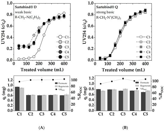 Cyclic adsorption: dynamic breakthrough curves, as represented by the UV 254 absorption, adsorbed and desorbed DOC loadings and %RDOC for (A) Sartobind® D and (B) Sartobind® Q. Feed: pH 7, DOC: 5 mg/L, UV254: 19.3 m−1, 0 mmol/L NaCl, Flux 500 LMH. Regeneration with 1 M NaOH.
