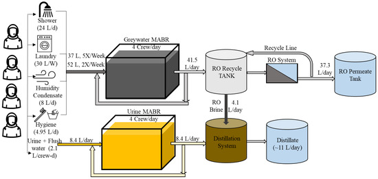 Simplified process flow diagram for proposed hybrid habitation wastewater treatment system. Flow rates reflect a load of four crew members per day. The graywater MABR receives 37 L of graywater, excluding laundry five times per week and 52 L two times per week, which includes laundry loads in addition to graywater. The graywater effluent (~41.5 L) discharges as a pulse to the RO system recycle tank once daily. The urine reactor receives 8.4 L of urine + flush water over an 18 h period (wake cycle) and an estimated 24 urine events. The brine from RO processing and urine reactor effluent are transferred to the distillation system for treatment.