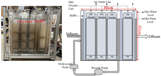 Based on previous studies, the graywater MABR was designed and built to have sufficient capacity for four crew members, and the required nominal retention time was 4 days on average. Figure 3 shows the graywater MABR details and characteristics. The loading of the reactor occurred as the wastewater was produced, reflecting how the system would operate if it was the only storage tank. Based on this, the reactor’s total and minimum wet volumes were designed as 238 and 169 L, respectively. The reactor comprises four independent siloxane membrane aeration modules with an inlet and outlet air header per module. Each module contained 374 hollow non-porous siloxane tubes with an ID and OD of 0.245 cm and 0.55 cm, respectively. All four headers received oxygen at 100 mL/min, regulated by mass flow controllers. The specific surface area of the MABR was ~100 m2/m3. A recycle pump (Goulds Water Technology, Auburn, NY, USA) operated at 22 L/min provided mixing in the reactor. The effluent was manually discharged from the effluent zone of the reactor once per day by gravity.