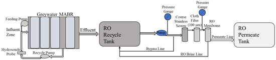 Graywater MABR-RO system flow diagram with membrane filtration module.