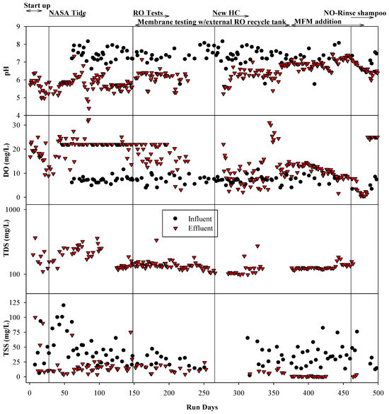 Samples for water quality (e.g., anions and cations) were collected from the graywater stream constitutive (e.g., laundry, humidity condensate, laundry, etc.) every day at the beginning of the experiment. After six months of operation, this process was adjusted to three times per week. The effluent samples were collected from the effluent immediately after transfer to the RO recycle tank. A portable Hach H11d Multiparameter pH/ORP meter was used to measure pH and DO in the reactor. Samples were also collected from the final permeate and brine.