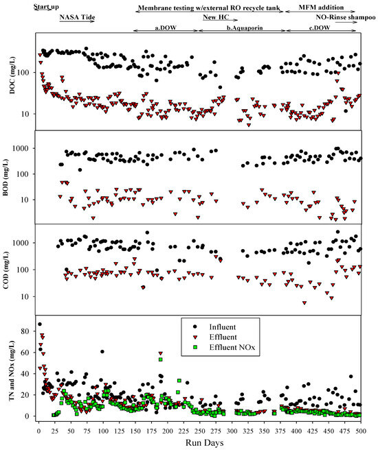 Graywater MABR effluent (RO influent) DOC, BOD, COD, and TDS values were similar during the testing of both membranes (Table 2). Average TN and TSS concentrations were higher (but still within one standard deviation) during the testing of the DOW membrane than during the Aquaporin. As almost all TN was present as NOx−, it is possible that the lower TN values were due to nitrate reduction as DO concentrations were lower during the Aquaporin membrane test. While DO was generally high enough in the bulk liquid to inhibit denitrification, it is possible that in the biofilms, the DO was lower. The concentrations of all parameters were fairly constant during each test (Figure 9). The concentrations of DOC, BOD, TN, NOx−, and TDS in the RO permeate were very similar over time and between membranes (Figure 9 and Table 2). There did not appear to be any change in RO permeate quality over the runtime for either membrane. For both membranes, the permeate quality was very good, with average DOC, TN, BOD, and TDS permeate concentrations of 4, 2, 5, and 8 mg/L and 5, 2, 5, and 10 mg/L for the DOW and Aquaporin, respectively (Table 2). These concentrations represent a ~98% reduction in DOC, BOD, and COD and a 95% reduction in TDS, which would significantly reduce the downstream fouling potential and the consumption of mixed beds in the WPA, major issues for the ISS.