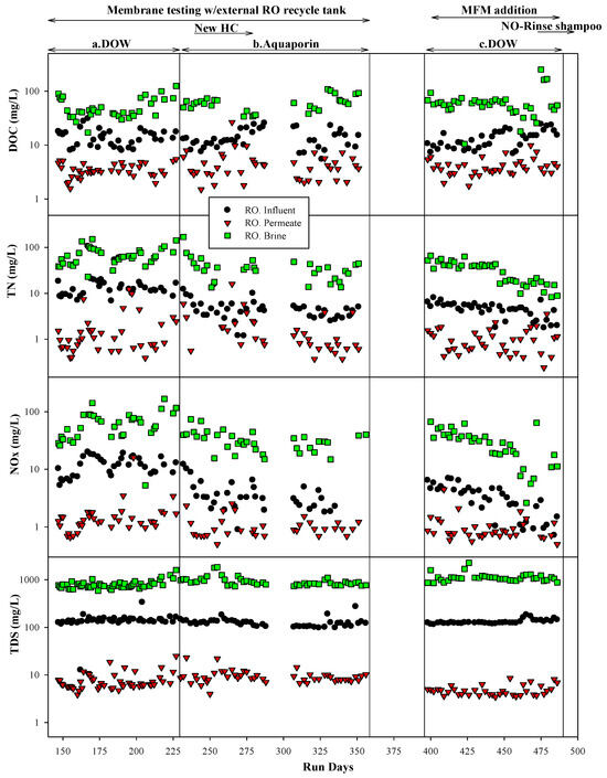RO system water quality performance over all tests. Tests included a system with an external RO recycle tank with two different membranes ((a) DOW membrane and (b) Aquaporin membrane) and a system with an external RO recycle tank but an MFM installed in the MABR ((c) DOW membrane).