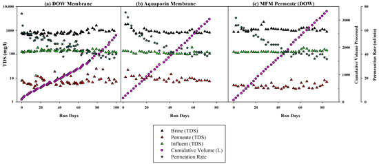 RO system performance with two different membranes: (a) DOW membrane, (b) Aquaporin membrane, and (c) DOW membrane during MFM setup.
