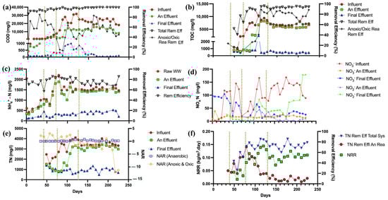 Performance of AnMBR—A/O MBR system in organic and nitrogen compound removal: (a) COD level variation with removal efficiencies, (b) TOC level variation with removal efficiencies, (c) NH4+-N level variation with removal efficiencies, (d) NOx level variation, (e) TN variation and NAR variation, (f) NRR variation and TN removal efficiencies of the system.