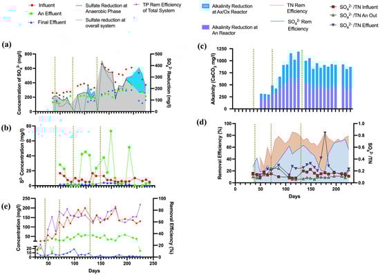 Performance of AnMBR—A/O MBR system in sulfur and TP compound removal: (a) SO42− level variation with removal efficiencies, (b) S2− level variation, (c) alkalinity level reduction at anaerobic reactor and anoxic/oxic reactor, (d) TN, SO42− removal efficiencies and SO42−/TN ratio variations, (e) TP level variation with removal efficiencies of the system.