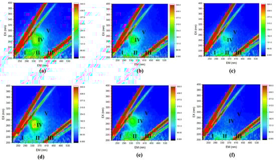 Fluorescence excitation and emission matrix of the membrane cleaning solutions: (a) permeate cleaning solution for An Mem; (b) NaOCl cleaning solution for An mem; (c) citric acid cleaning solution for An mem; (d) permeate cleaning solution for Ox Mem; (e) NaOCl cleaning solution for Ox mem; (f) citric acid cleaning solution for Ox mem. Region I: tyrosine-like proteins; Region II: tryptophan-like protein; Region III: fulvic acid-like (FA) substances; Region IV: soluble microbial by-product-like substances; Region V: humic acid-like (HA) substances.