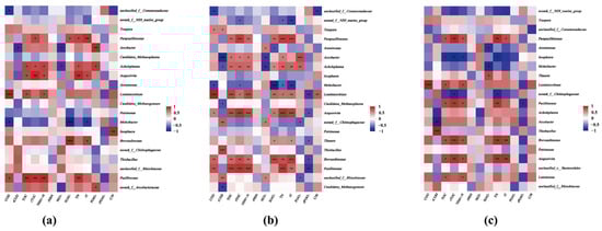 Spearman correlation heatmaps of (a) anaerobic; (b) anoxic; and (c) oxic reactors, corelating environmental factors and genus-level species (rCOD, rTOC, rNH4, rPO43−, and C/N represent the removal efficiencies of COD, TOC, ammonia, total nitrogen, phosphate, and COD/TN ratio, respectively). The * denote statistical significance levels: * p < 0.05, ** p < 0.01, *** p < 0.001.
