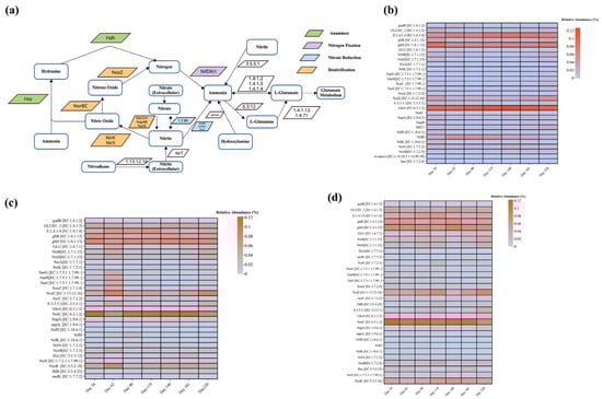 Enzyme and gene abundance of key metabolic pathways of reactors: (a) N cycle and relative abundance of enzymes involved in N cycle; (b) anaerobic reactor; (c) anoxic reactor; (d) oxic reactor.