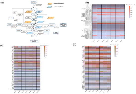 Enzyme and gene abundance of key metabolic pathways of reactors: (a) S cycle and relative abundance of enzymes involved in S cycle; (b) anaerobic reactor; (c) anoxic reactor; (d) oxic reactor.
