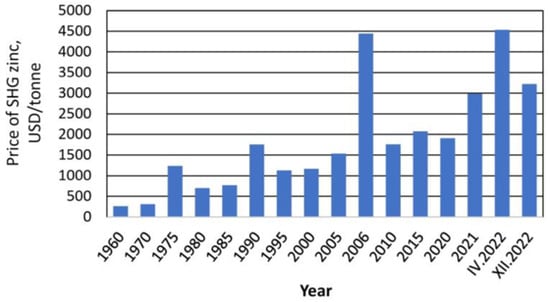 Currently, Zn is one of the most important metals for the development of technology [27]. World Zn reserves are estimated at 250 million tons and are projected only to last the next 17 years [28]. The increasing demand for Zn may limit its future availability, and the cost will be higher. Figure 1 presents the variation in the price per ton of Zn over time.