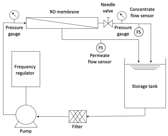The RO pilot system was mounted on an aluminum and stainless steel bracket. The system operated in a closed circuit, which means that the water from the storage tank was pumped to the RO module (membrane), and there were two outlets (concentrate and permeate) that were returned to the storage tank. Figure 3 presents a technical scheme of the RO system.