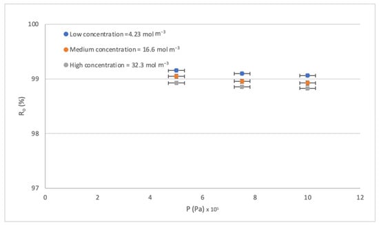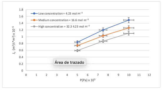 The behavior of the RO membrane during the separation process can be evaluated as a function of two variables: the analytical flux with temperature correction (Jv) and the operating pressure (P). In Figure 4, Jv and P are directly proportional, like a membrane’s normal behavior. Three concentration levels were used, and an inverse proportionality was identified between the Jv values and the concentration of the synthetic waters. The high concentration curve is below the low and medium concentration curves. The above is explained by the phenomenon of concentration by polarization (CP), which occurs on the surface of the membrane and affects mass transfer. It is known that when working at low pressures, the behavior of flux with pressure tends to be linear, so the physical compaction of the membrane is not observed when solute concentrations are low.