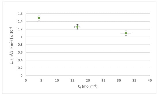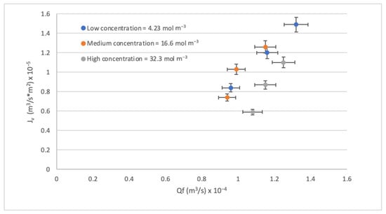 Another way to physically evaluate an RO process is by observing the effect of feed flow Qf on the Jv. As seen in Figure 5, increasing the Qf with low concentrations increases the velocity, which increases the mass transfer coefficient by increasing the Jv. On the contrary, the increase in concentration also causes the CP to increase, generating a decrease in the Jv. Other studies have also described the above [59,60]. Another important thing to highlight from Figure 6 is that the effect of Qf on the Jv is not noticeable in low and medium contractions but is more noticeable in high contractions. A drop in Jv can also be observed as the concentration increases, but in any case, the Jv maintains the same trend with all concentrations.