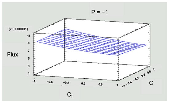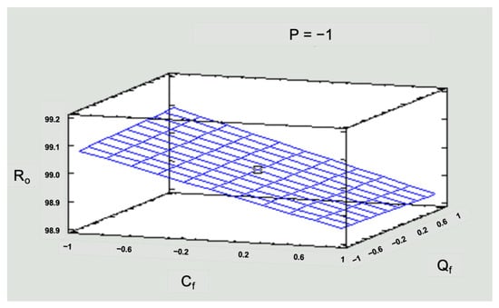 The operating variables that were taken were pressure “P”, income flow “Qf”, and the concentration of synthetic water “Cf”. For each variable, three levels of operation were considered: low, medium, and high. The response variables we sought to analyze were the average analytical flux “Jv” and the rejection index “Ro”. To determine the number of tests necessary for the operating variables to interact with each other with their three levels, a design of experiments was carried out with the Statgraphics Centurion XVIII program using the “Design of Experiments Assistant” application. The type of experimental design used was a factorial fraction with three levels. The number of representative trials for the experiment was nine. For each test, the levels of the operating variables were different, allowing the process to be evaluated in different scenarios.
