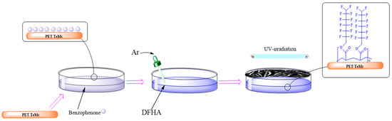 Graft polymerization is a useful method for introducing a range of functional groups onto the surface of a polymer. Introducing new reactive sites can modify polymeric surface morphologies, enhancing specific material properties [34]. Modification of PET TeMs surfaces was carried out by photo-induced graft polymerization of DFHA to create a hydrophobic layer. Figure 1 shows the scheme of the photoinitiated graft polymerization of DFHA. The hydrolysis and subsequent oxidation of PET occurred after chemical etching produced carboxyl and hydroxyl groups on the chains. These groups are involved in the process of attaching the monomers in the graft polymerization process [35].