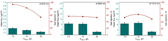 Figure 5 shows that the degree of salt rejection decreased from 94% to 44% with an increase in pore size from 670 nm to 1310 nm. Increasing the pore diameter from 670 to 1310 nm leads to an increase in water flux, as a greater amount of water can pass through larger pores. According to the results obtained, there is a slight decrease in the purification rate with increasing salt concentration. Most ocean water contains about 35 g of salt per liter of water [41]. As shown in Figure 5, increasing the salt concentration from 7.5 to 30 g/L results in a decrease in the water flux from 0.232 to 0.125 kg/m2 h for the 670 nm pore size membrane. Increasing the NaCl concentration reduces water activity and the water vapor pressure and increases the water viscosity and the temperature polarization at the membrane surface [42]. However, it should be noted that at pore diameters of 890 and 1310 nm, there is no significant change in performance with increasing salt concentration, as seen for membranes with a pore diameter of 670 nm. For membranes with pore diameters of 890 and 1310 nm, a decrease in performance is observed at a salt concentration of 30 g/L. A high salt concentration increased the risk of membrane fouling, reducing its water flux. As the concentration of NaCl in a solution increases, the viscosity of the solution also increases. A higher viscosity can impede the flow of the solution through the system, thereby reducing the mass transfer rate and consequently the water flux through the membrane. Therefore, the data obtained for salt rejection can be considered competitive if compared with many works reported in the literature and are summarized in Table 3.