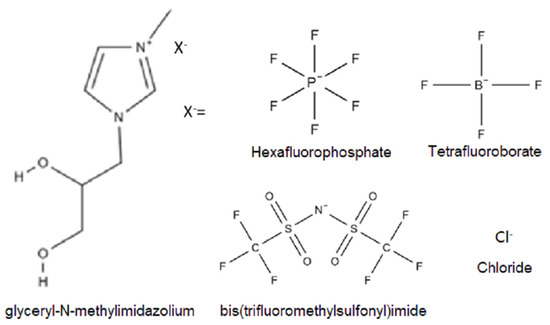 - Bellina, F.; Bertoli, A.; Melai, B.; Scalesse, F.; Signori, F.; Chiappe, C. Synthesis and Properties of Glycerylimidazolium Based Ionic Liquids: A Promising Class of Task-Specific Ionic Liquids. Green Chem. 2009, 11, 622–662. [Google Scholar] [CrossRef]