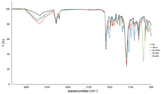 The molecular weight distributions (PD, polydispersity) and the weighted molecular weights (Mw) of the PILs are presented in Table S1. The Mw values ranged from 43,264 gmol−1 to 70,655 gmol−1, while the polydispersity (PD) ranged from 1.2 to 1.4. In Figure 3, spectra obtained for the PILs are shown, and Figure 4 shows the enlargements of the spectra in the regions of 3000–3700 cm−1; 1600–1800 cm−1; and 650–1350 cm−1. FTIR spectra (Figure 3) showed characteristic bands found for polyurethanes: 2936–2871 cm−1 (CH2 and CH3 stretching), 1536 cm−1 (N–H bending groups), 1246 cm−1 (vibration of C-N and C-O groups of urethane), 1041 cm−1 (stretching of C–O–C groups of urethane), and 955 cm−1 (stretching of C–O–C groups of polycarbonate diol) [45]. The bands characteristic of H bonds present in polyurethanes were also evaluated: the region between 3200 and 3500 cm−1 corresponding to the stretching vibration of the N-H group of urethane (Figure 4A) and the region between 1700 and 1730 cm−1 characteristic of bonded and non-bonded carbonyl groups, respectively (Figure 4B). Shifts in characteristic bands (N-H and C=O) evidence possible H bonds. Figure 4A shows the characteristic bands of the stretching vibration of urethane N-H groups, where the region around 3400 cm−1 corresponds to non-bonded N-H groups and the band in the region of 3300 cm−1 characterizes the vibration of bonded N-H groups. All PILs showed an increase in intensity in the regions of bonded and non-bonded N-H groups with the insertion of IL into the polymeric chain. Also, concerning the structure of polyurethane, Figure 4B contains an enlargement of this area between 1600 and 1800 cm−1. In this range, it is possible to observe bands related to non-bonded carbonyl groups near 1730 cm−1 and bonded carbonyl groups near 1700 cm−1 [27]. In Figure 4B, changes in the spectrum were also noticed only when IL insertion is performed, such as the displacement of the band ~1730 cm−1 to values close to ~1710 cm−1. The appearance of characteristic bands of bonded carbonyl groups in the regions of 1700 cm−1 for samples with Cl, PF6 and BF4, and 1650 cm−1 for samples with NTf2, PF6, and BF4 counterions was observed, indicating the formation of H bonds [26,27]. The absence of the characteristic band for the stretching vibration of the N=C=O group in the region of 2270 cm−1 confirms the absence of free NCO groups in the polymeric material, indicating the formation of PU [27,29,46]. Bands related to the counter anions present in the samples can also be visualized (Figure 3). The PIL-BF4 sample presents a broad band near 1060 cm−1, indicating the presence of the B-F bond [41,42,43]. The PIL-PF6 presents a band near 835 cm−1 related to P-F bonds. For PIL-NTf2, a band near 1346 cm−1 related to SO2 bond vibrations was observed, as well as bands near 1136 cm−1 and 1189 cm−1 related to C-F bond vibrations [41,42,43].