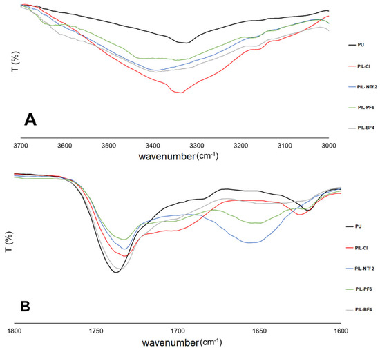 Infrared spectra of PU and cationic PILs. (A) 3000–3700 cm−1; (B) 1600–1800 cm−1.