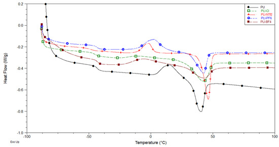 The DSC curves obtained for the polymeric samples are presented in Figure 5. The glass transition temperatures (Tg) values of −44.7, −47.9, −43.2, and −42.7 °C were found for the samples PIL-Cl, PIL-NTf2, PIL-PF6, and PIL-BF4, respectively. By comparing the values obtained for the PILs with the result obtained for pure PU (−42 °C), it is possible to perceive a decreased tendency in the Tg values for all PILs in relation to the non-ionic PU, which could mean that the addition of ILs in the polymeric chain increases the separation of the polymer microphases. This separation of microphases facilitates the mobility of the chains [26,27]. From the analysis of the thermograms, it is possible to identify the existence of an endothermic peak which can be attributed to the melting of a crystalline microphase (Tmf). This endothermic peak is characteristic for PU-based polymers that use polyol PCD with a molecular weight of 2000 g/mol in the polymer chain [26,27]. The results found for the PU, PIL-Cl, PIL-NTf2, PIL-PF6, and PIL-BF4 samples were, respectively, 40.1 °C, 42.2 °C, 46.4 °C, 42.8 °C, and 43.5 °C. Finally, the crystallization temperature (Tc) was obtained for the PIL-Cl sample (−12.7 °C).