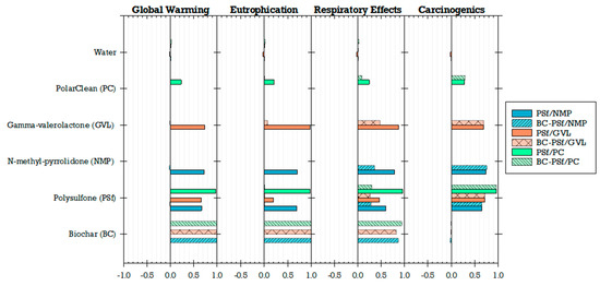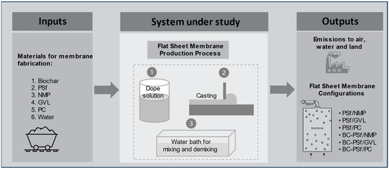 The goal of the LCA was to compare the global environmental impacts of producing biochar-based polymeric flat-sheet membranes synthesized from various solvents at the laboratory scale level. The system boundary was cradle-to-gate, including all processes for membrane fabrication until the point of application for water treatment [34]. All the relevant raw materials, energy, utilities (e.g., water), chemicals, and emissions involved at the production stage were within the system boundary. Environmental impacts due to the transportation of the materials, electricity used to operate the laboratory and equipment during experiments, the production of machinery, and the plant for flat-sheet membrane fabrication were not considered. Electricity used for the operation of laboratory equipment was excluded due to the inability to allocate consumption to individual projects. Similarly, as with transportation requirements for materials, it was assumed that electricity consumption remained relatively consistent to meet the production needs of all the design configurations and was therefore excluded. The production of a 1000 m2 flat-sheet membrane was taken as the functional unit. The lab scale results for 1 m2 were scaled linearly to this functional unit such that all inputs (materials and energy) and outputs (emissions) are evaluated on a per functional unit basis.