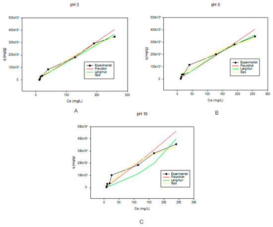 Graphs showing the adsorption isotherm models at pHs of 3, 6, and 10, which correspond to (A), (B), and (C), respectively. For better visualization of the data, the graphs were not started at the 0.0 point.