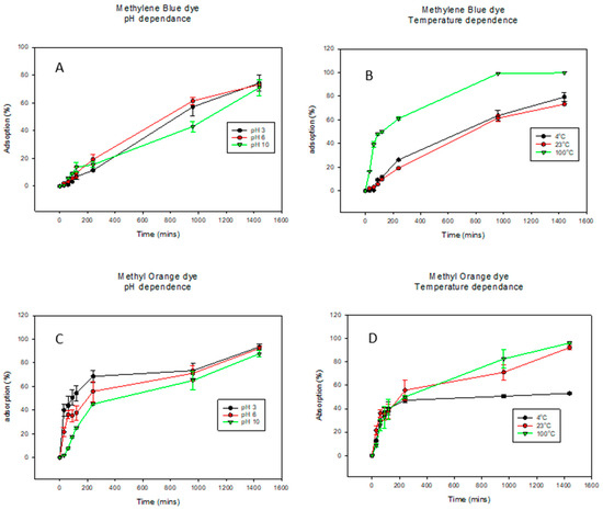 Graphs showing the percent of dye adsorbed over time under varying pHs and temperatures. Methylene blue dye graphs are (A) for pH dependence and (B) for temperature dependence while methyl orange dye graphs are (C) for pH dependence and (D) for temperature dependence. For better visualization of the data, the graphs were not started at the 0.0 point.