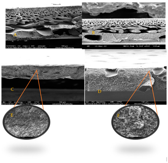 SEM images obtained at X500 showing the cross-sections of membranes (A) PSf-NMP, (B) BC-PSf-NMP, (C) BC-PSf-GVL, (D) BC-PSf-PC, (E) BC-PSf-GVL zoomed in, and (F) BC-PSf-PC zoomed in.