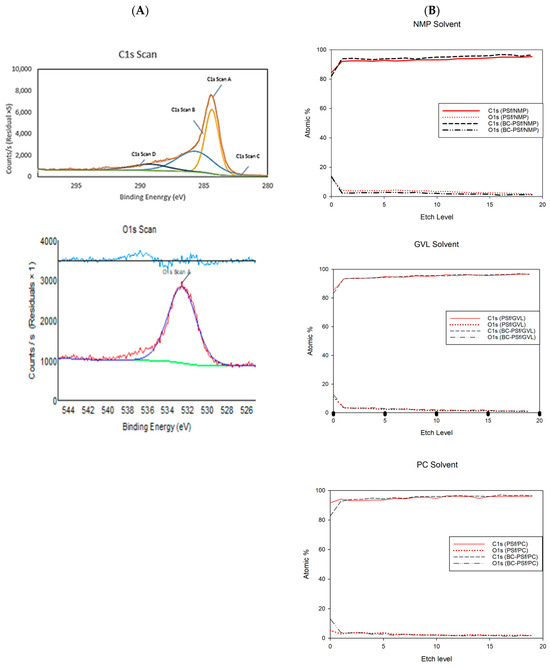 To further understand how the biochar was incorporated into the membrane matrix, an XPS depth profile was carried out. For the membranes made with NMP as a solvent, in both the PSf-NMP and BC-PSf-NMP membranes, there was an increase in the atomic percent of both the C1s and a reduction in O1s content as the membranes were etched. The increase and decrease in the C1s and O1s, respectively, was higher in the PSf-NMP membranes. This meant that as membranes were etched further, more carbon was found. This corresponded with the results provided in Table 5, where there was an overall increase in the C1s content as biochar was introduced into the matrix. The same trend was observed in the membranes made from GVL and PC as seen in Figure 5B.