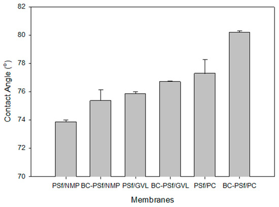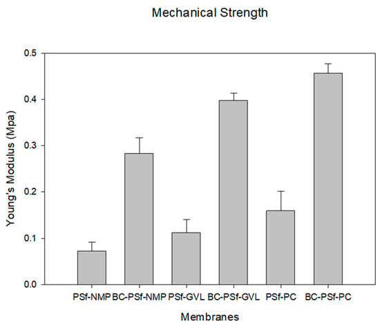 SEM images, Figure 4, show similar finger-like structures of both control membranes (PSf/NMP) in A as well as the membrane with biochar incorporated in it (BC-PSf/NMP) in B. Finger-like pore structures are often attributed to fast/instantaneous mixing and de-mixing of the solvent and the non-solvent [24]. The membranes synthesized from eco-friendly solvents GVL and PC in Figure 4C,D, respectively, presented fewer micro voids and more of a spongelike pore structure, which is consistent with those reported in the literature [24]. Zoomed in, the BC-PSf-GVL membranes exhibited more of an open-cell spongelike structure (E) while those of BC-PSf-PC showed an open interconnected spongelike structure (F). The sponge-like pore structure can be attributed to a slowed-down mixing and de-mixing process. The active layers of the biochar-based membranes were more visible as opposed to those of the control membranes, especially in the membranes made from the NMP solvent. This could be attributed to the high surface area and adsorbent quality of biochar [79]. Incorporating biochar into the PSf membrane matrix can slow down the rate of de-mixing of the solvent and non-solvent, allowing for the thicker active layer to form. This is because it behaves as a pore former capable of suppressing the micro voids with the membranes and affecting mass transport across the membrane surface [24].