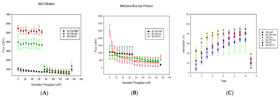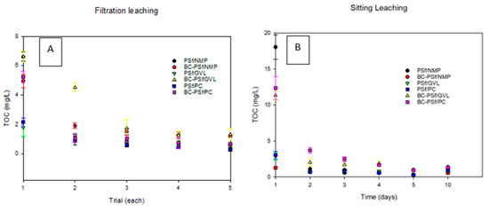 To understand the stability of biochar within the various membranes, leaching studies were carried out via sitting/soaking, and filtration. Under sitting/soaking experiments, the membranes were soaked in DI water for 10 days, and samples were taken and analyzed for total organic carbon (TOC) using the TA-550 TOC analyzer (New Castle, DE, USA) at varying times. For filtration experiments, DI water was filtered through each membrane for 15 min. Five filtrations were performed for each membrane and samples were analyzed for TOC.