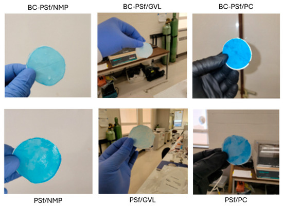 Polymer dissolution and membrane formation were adapted from the literature [21,59]. For biochar-containing membranes, biochar granules were dissolved in various solvents in a flask at a constant temperature of 80 °C and intermittent sonication for full dissolution. The components were stirred for varying numbers of days (ranging from 2 to 8 days) to obtain a homogeneous dope solution. The weight fraction of the polymer was 17%, the weight fraction of the solvents was 83%, and the total weight fraction of the biochar additive within the polymer was 2%. The solution was then degassed for 1 h. before membrane casting to remove any associated bubbles. The non-solvent-induced phase separation method (NIPS) was used for membrane formation. The NIPS method is ideal for the formation of flat-sheet polymeric membranes [60]. It involves casting the dope solution onto a substrate and then transferring the casted membranes with the substrate into a non-solvent bath where the solvent migrates from the polymeric matrix to the non-solvent bulk, while the non-solvent bulk enters the matrix through the created channels and is exchanged with the solvent [61]. The dope solution was cast on a glass plate using a doctor blade. The glass and the cast membrane were then transferred to a water bath maintained at room temperature immediately after membrane casting. The water bath acts as a non-solvent, which allows for mixing and de-mixing to occur [60]. Finally, the resulting membranes were stored in DI water for the removal of residual solvent. The specified conditions for each membrane formed can be seen in Table S1.