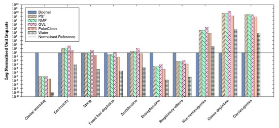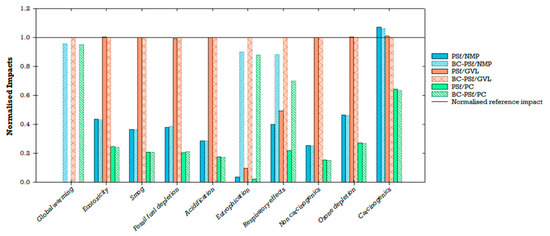 Life cycle impact assessment (LCIA) was conducted using the Tool for the Reduction and Assessment of Chemicals and Other Impacts (TRACI) 2.1 version 1.05 developed by the U.S. Environmental Protection Agency [63] and implemented using SimaPro [64,65]. TRACI includes ten environmental impact categories: ozone depletion (kg CFC-11 eq), global warming (kg CO2 eq), acidification (mol H+ eq), eutrophication (kg N eq), smog (kg O3 eq), respiratory effects (kg PM2.5 eq), carcinogenic (CTUh), non-carcinogenic (CTUh), ecotoxicity (kg 2,4-dioxane eq), and fossil fuel depletion (MJ surplus) [63].