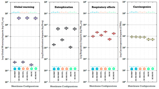 Ecoinvent was accessed through SimaPro v.9.0.0.49 Ph.D. modeling software to obtain LCI data from various sectors such as energy production, transport, building materials, and chemical production, among others. Foreground data (Table S2 of the Supplementary Materials) from the laboratory-scale fabrication of a 1 m2 flat-sheet membrane was used while background data were sourced from the literature and life cycle inventory databases (Tables S3–S8 of the Supplementary Materials) [40,41,42]. The biochar is produced by slow pyrolysis of wood logs using a kiln-based technology, and the associated inventory data for biochar powder were sourced from studies conducted by Smebye et al. (2017) and Shaheen et al. (2022) (Table S3 of the Supplementary Materials). By percentage volume, the biochar, polymer, and solvent combinations constituted up to 1%, 44–47%, and 53–55% of the flat-sheet membrane, respectively (Table 1).