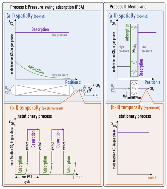 Conceptual comparison of PSA and membrane processes for CO2/N2 separation. Panels (a) show the CO2 mole fraction XCO2 in the gas phase as a function of the position z: (a-I) in the adsorption column and (a-II) in the membrane at a point in time t. Panels (b) show the CO2 mole fraction in the gas phase as a function of the time: (b-I) at the column head for the PSA and (b-II) at the permeate side for the membrane. In the process I (PSA), adsorption and desorption take place at the same location (a-I) but at different times (b-I). In process II (membrane), adsorption and desorption are spatially separated (a-II) but occur simultaneously (b-II).